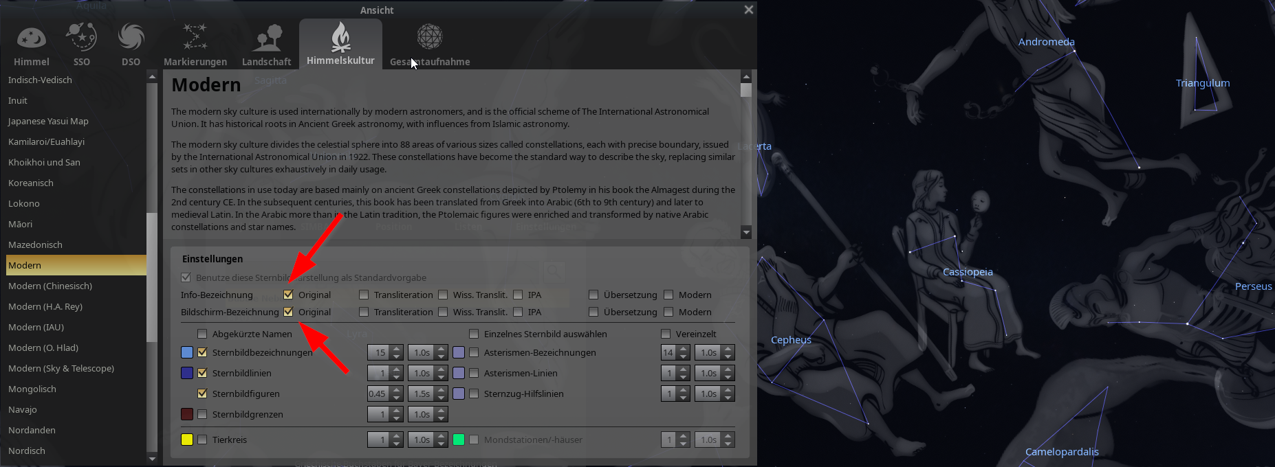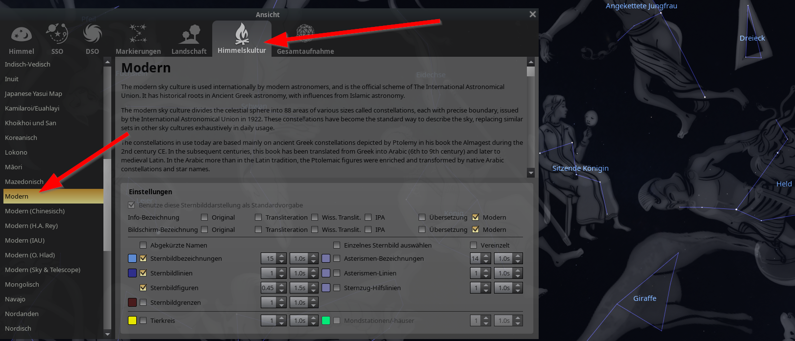 Dann auf „Himmelskultur“ und „Modern“ – Ich habe keine Ahnung wie die Stellarium-Macher auf diesen Namen gekommen sind.